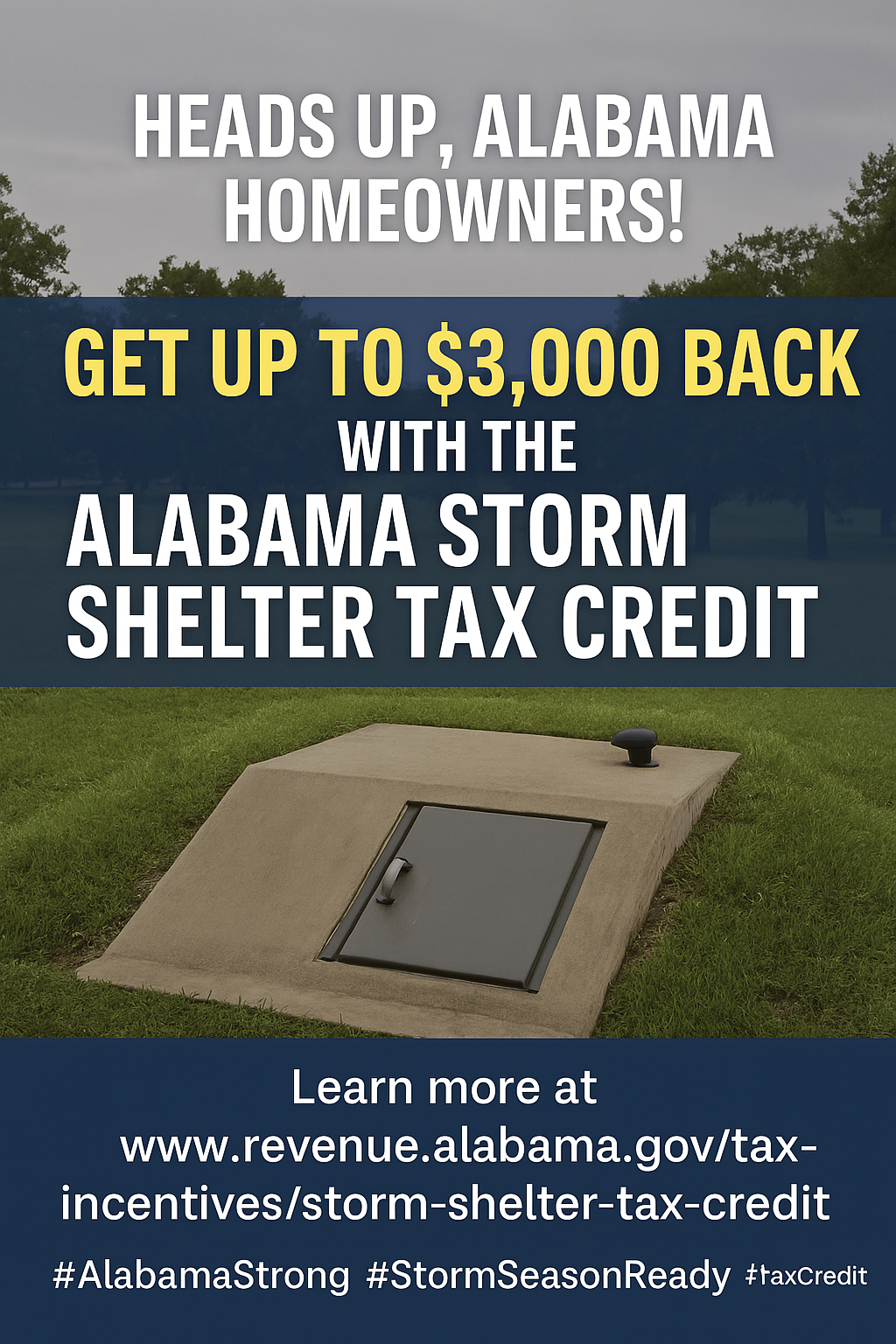 The Alabama Storm Shelter Tax Credit allows homeowners to receive 50% of the cost of installing a qualifying shelter—up to $3,000—at their primary residence. The shelter must meet FEMA safety standards and be installed between now and the 2028 tax year.